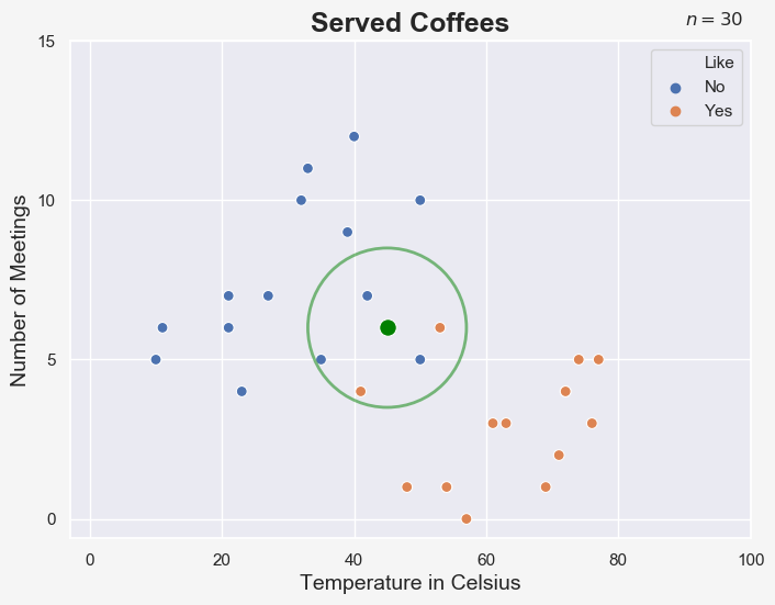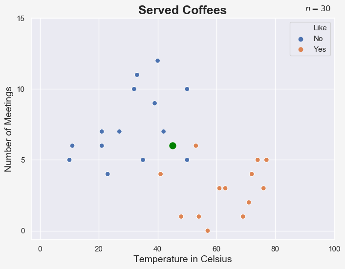 Suppose we have a coffee with a temperature of 45 degree Celsius, brought into the office on a day with 6 meetings, represented by the green point on our scatter plot: