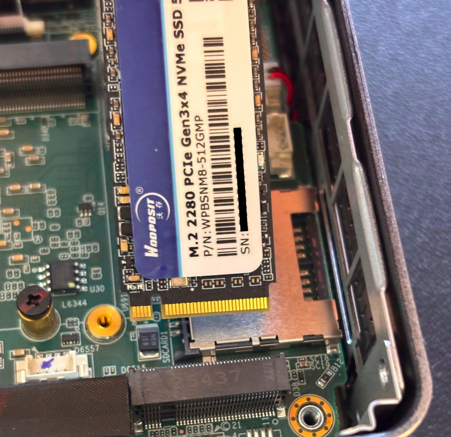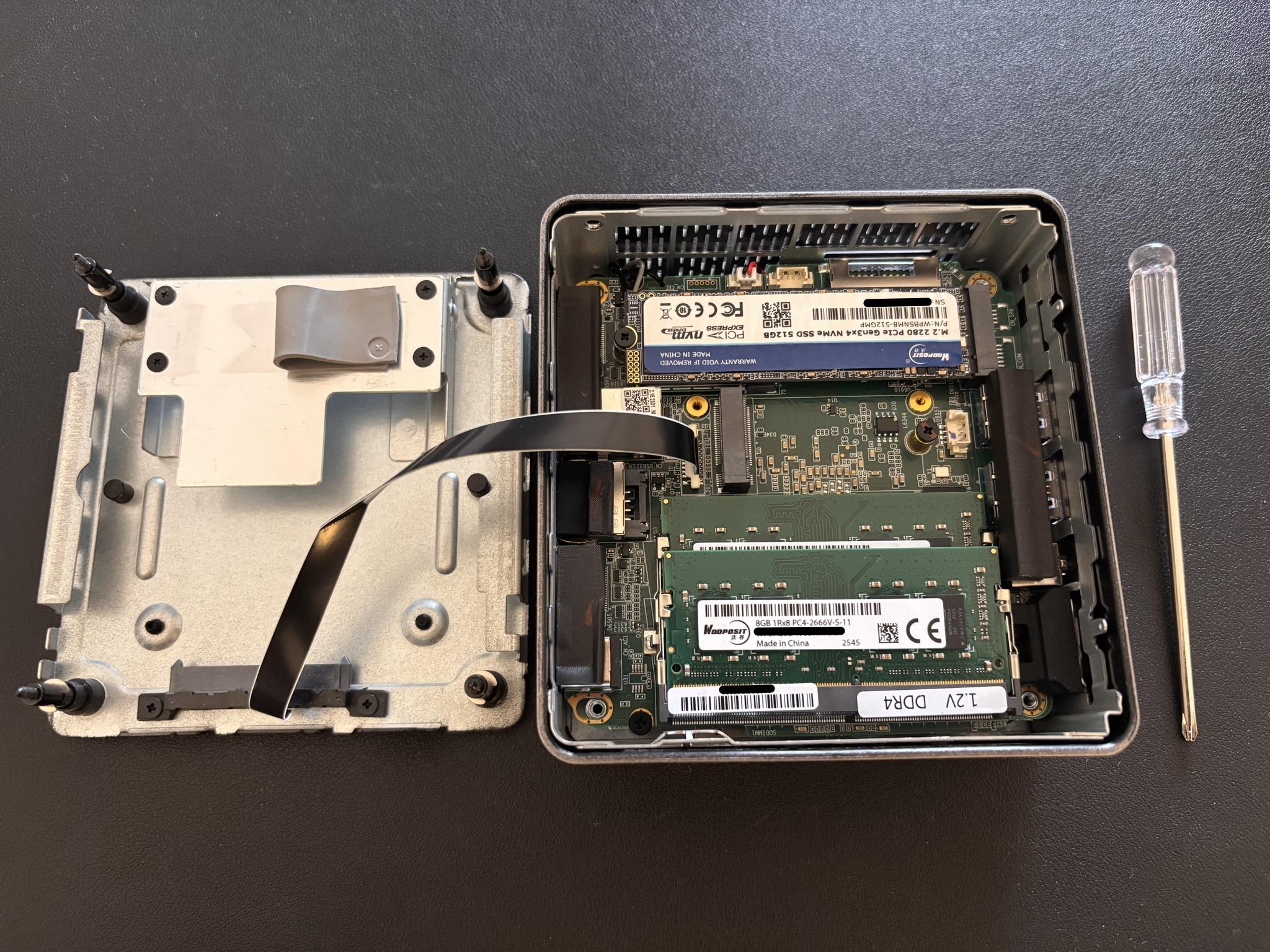 Opening the Geekom A5 is straightforward. Simply remove the four screws on the underside and lift off the cover. Carefully lift away the cover in order to prevent damaging the connection to the STATA slot.