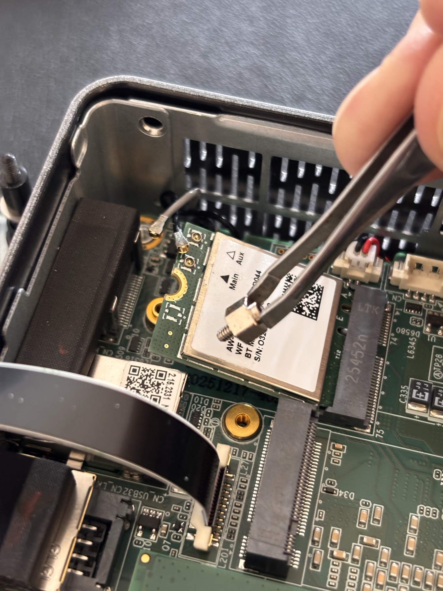 Now you can simply pull out the old WiFi card and put in your new WiFi card. Connecting the antenna cables (black to main and gray to aux) can be tricky in the Geekom A5, as the cables tend to detach easily. Here you simply need some patience to connect the cable, to put in the new WiFi card and to add the screw nut. Now you can also put back the transparent plastic cover on top of the WiFi card: